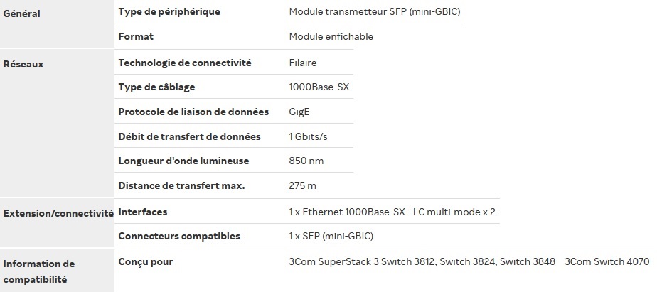 Transceiver 3com 3CSFP91 Émetteur-récepteur SFP 1,25 Gbit/s multimode 550 m 850 nm jusqu'à 275 m