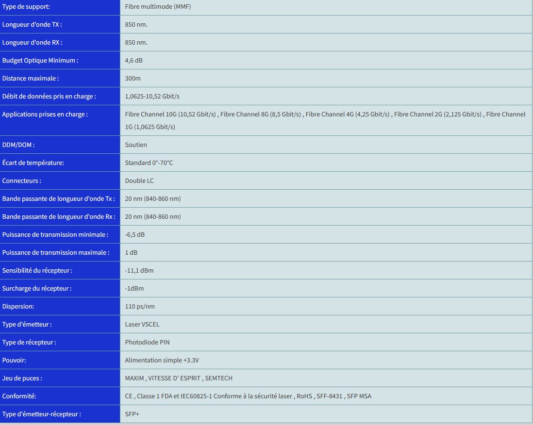 Transceiver Finisar FTLF8528P2BCV-QL Émetteur-récepteur SFP+ 8 Gbit/s multimode jusqu'a 300 m