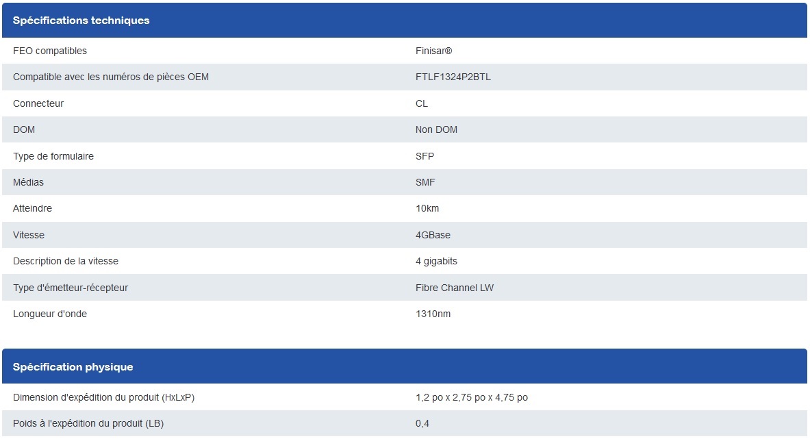 Cet émetteur-récepteur SFP compatible Finisar® FTLF1324P2BTL fournit un débit Fibre Channel 4GBase-LW jusqu'à 10 km sur fibre monomode (SMF) en utilisant une longueur d'onde de 1310 nm via un connecteur LC