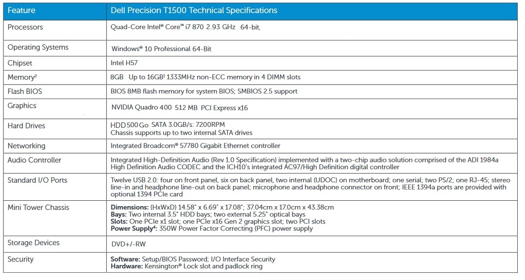 MT Intel Core i7-870 / 2.93 GHz - RAM 8 Go - Disque dur 500 go - DVD±RW (±R DL) / DVD-RAM – Nvidia Quadro 400 512mb - Gigabit Ethernet - Windows 10 Edition professionnelle 64 bits